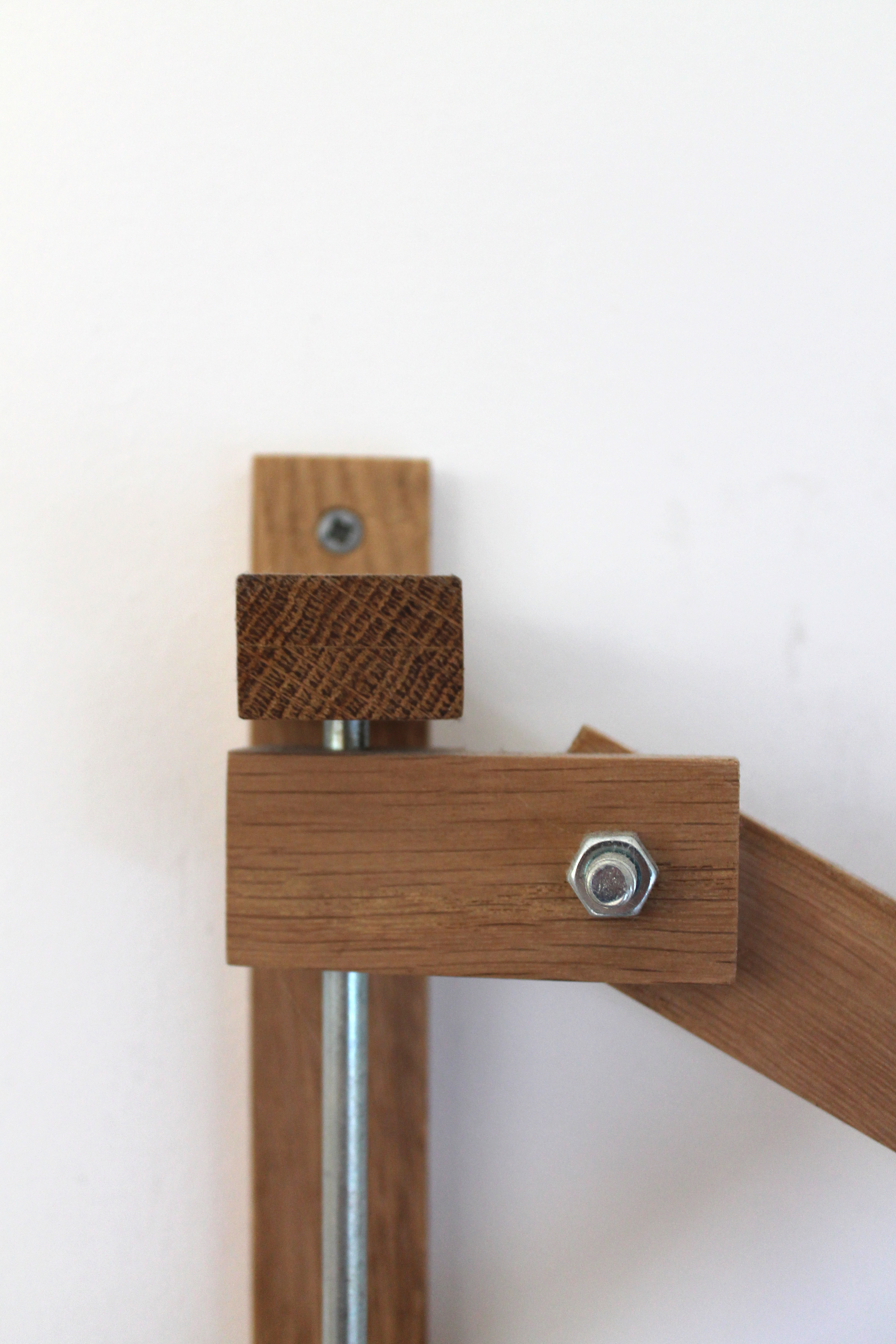 Deze lamp is een moderne versie van de welbekende schaarlamp. Voor het houten gedeelte van de lamp kunnen reststukjes van andere projecten gebruikt worden die alleen nog op maat geschaafd hoeven te worden. De kap heeft een eenvoudige lasergesneden sluiting en is gemaakt van milieuvriendelijk papier. Deze lampen zijn een tijd te koop geweest via online winkel Etsy.