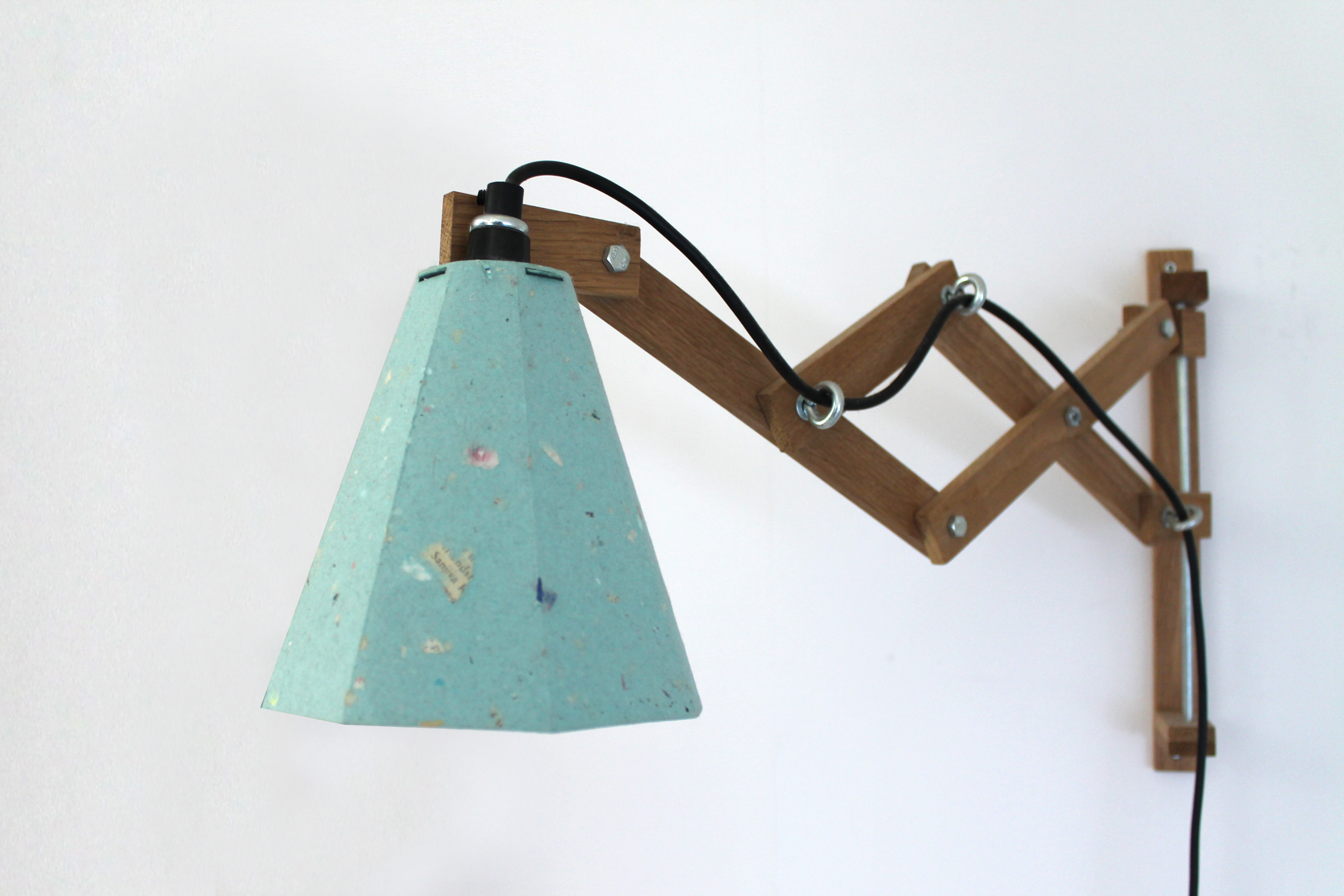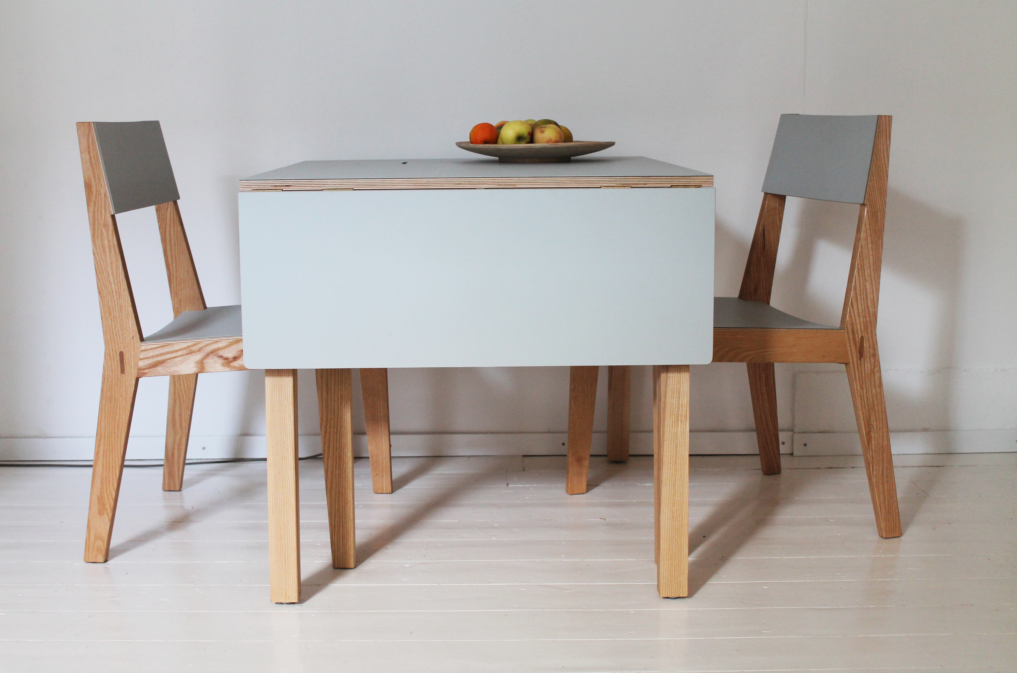 Het materiaal is deels gerecycled berkenmultiplex afgewerkt in milieuvriendelijke witte beits, het andere deel is opgetrokken uit biobased spaanplaat voorzien van een toplaag forbo meubellinoleum en een deel bedekt met eikenfineer afgelakt met mileuvriendelijke watergedragen lak.